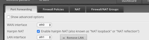 After I noticed that the connection was straight getting dropped while outside my network things worked as expected, I dug in a bit further and found two options that are probably the most low-hanging-fruit solution. The first was to enable the hairpin NAT option. This feature is also called NAT loopback. This option can be found under the “Port Forwarding” tab.